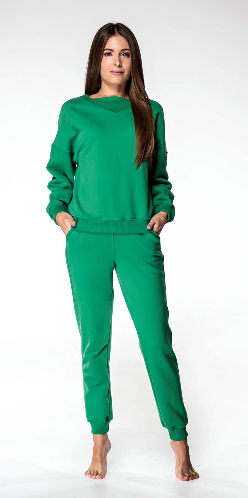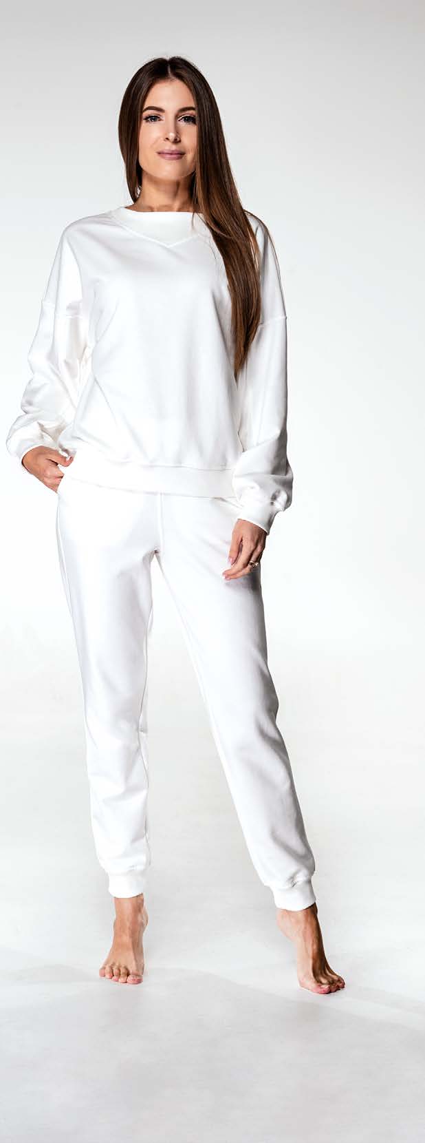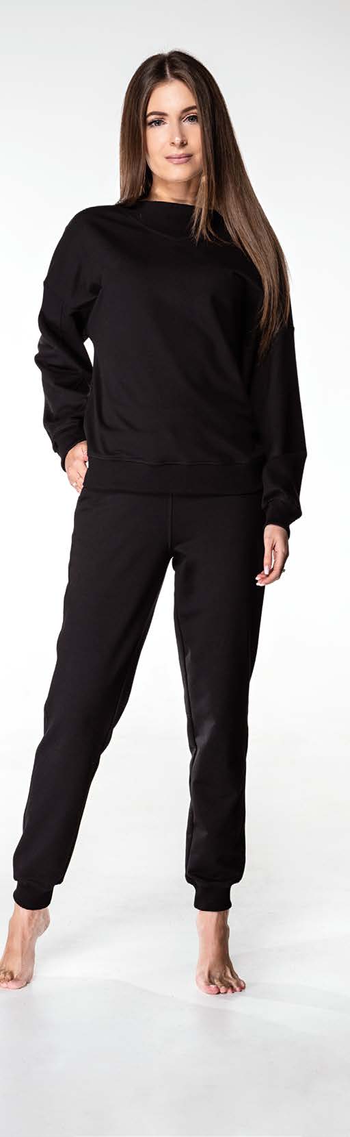 В комплекті світшот з декорованою вставкою на вирізі та завужені донизу штани з гумкою на поясі.