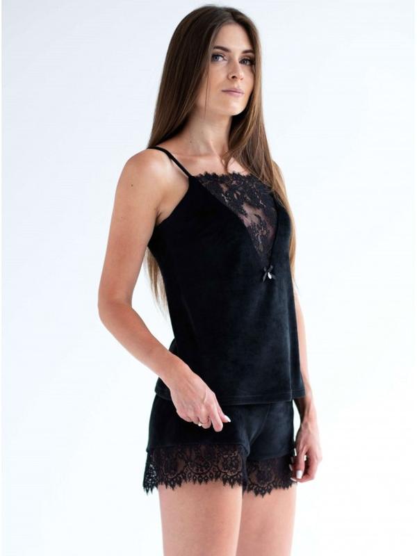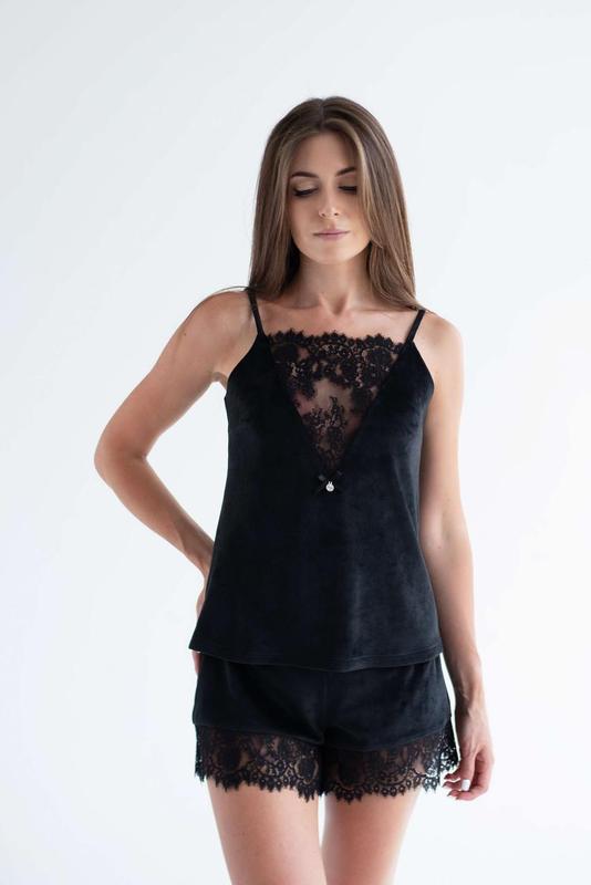 Піжама з бархатистого і приємного до тіла велюру високої якості, оздоблена мереживом.