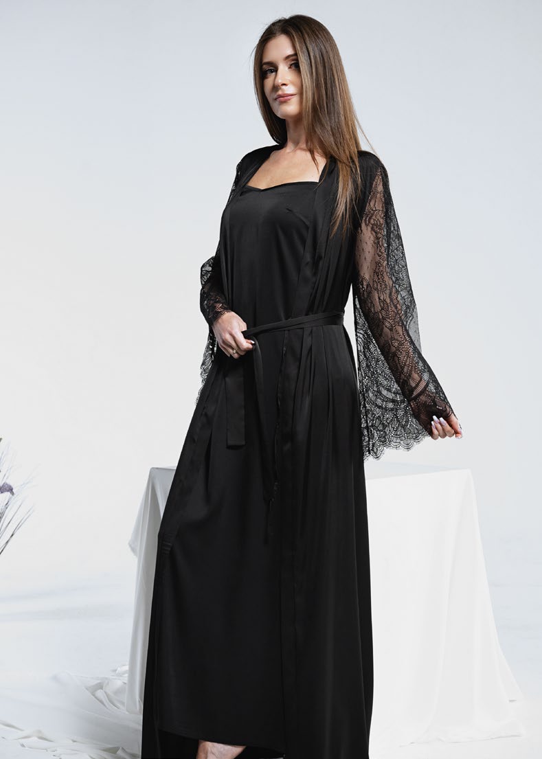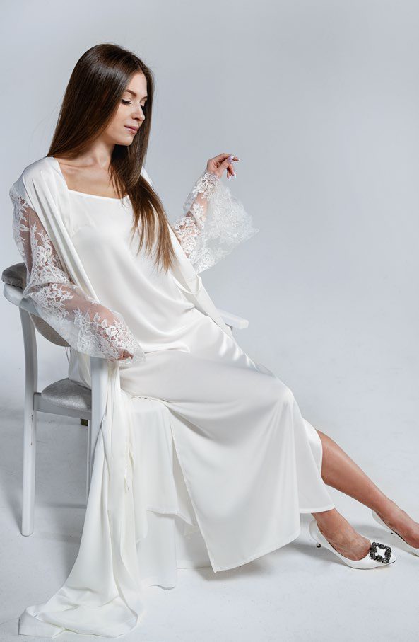 Розкішний жіночий халат з довгими широкими рукавами із витонченого мережива. Виготовлений із якісної, м’якої атласної тканини. Довгий пеньюар у підлогу додасть чуттєвості та романтики вашому образу.